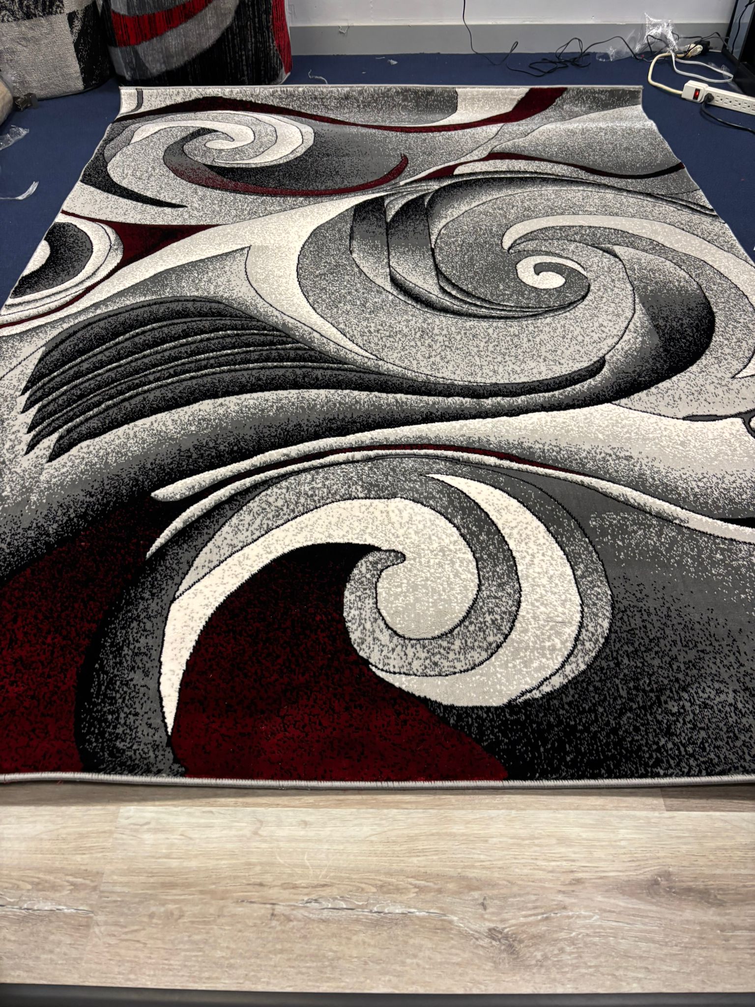 Transform your room with this bold abstract swirl rug, featuring a stunning fusion of black, grey, white, and deep red. The dynamic spiral design adds energy and modern style to any living space, making it a true statement piece.
