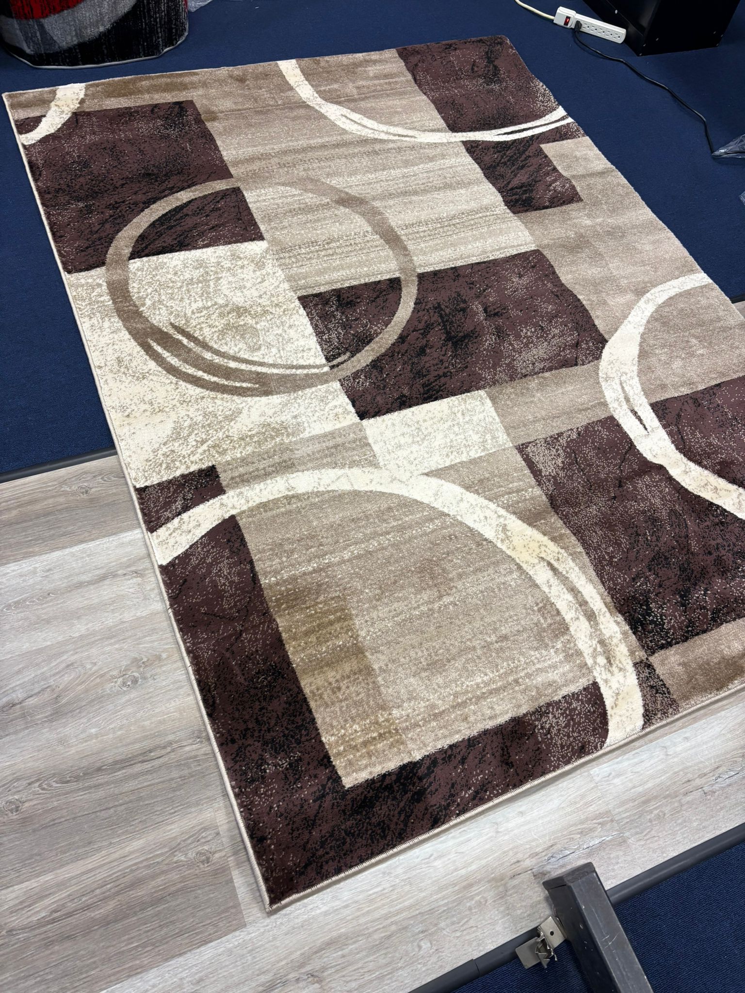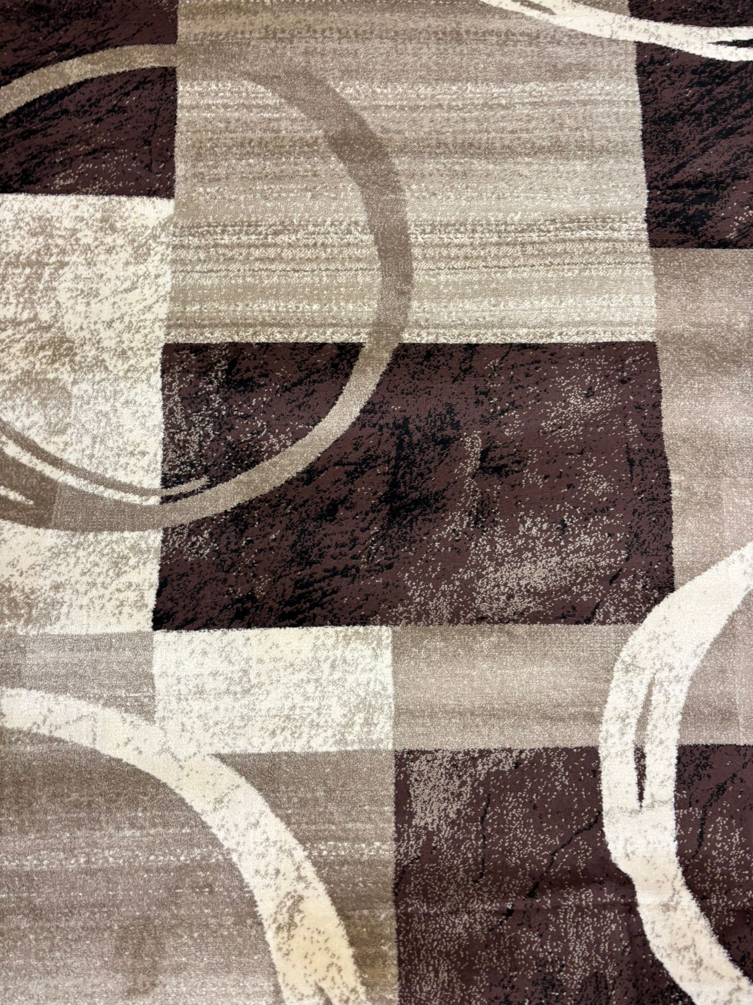 Bring warmth and modern flair to your space with this abstract rug featuring interlocking circles and blocks in elegant shades of brown, cream, and beige. Perfect for cozy living rooms, rustic interiors, or modern-neutral palettes.