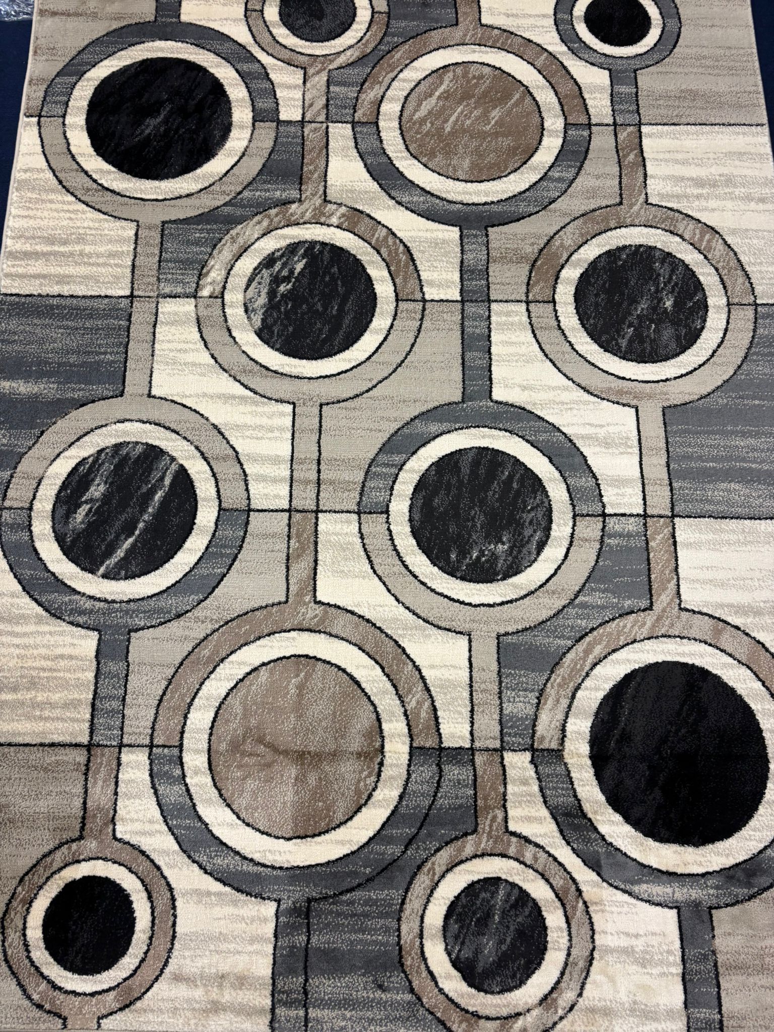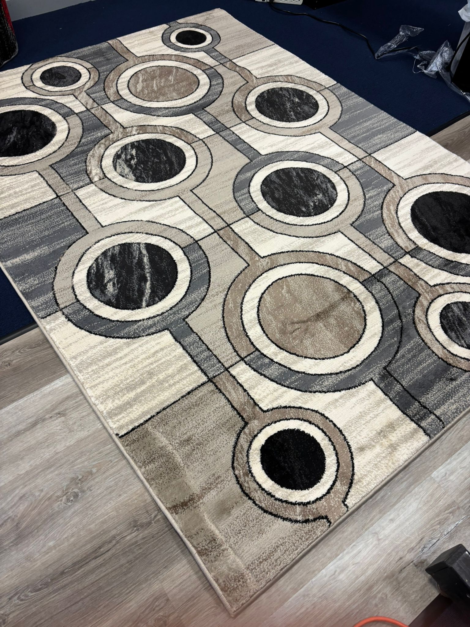 Transform your space with this modern geometric circle rug featuring bold black, soft greys, beige, and cream tones. The abstract circular design adds character while maintaining a clean and stylish appearance — ideal for modern, urban, or industrial-style interiors.