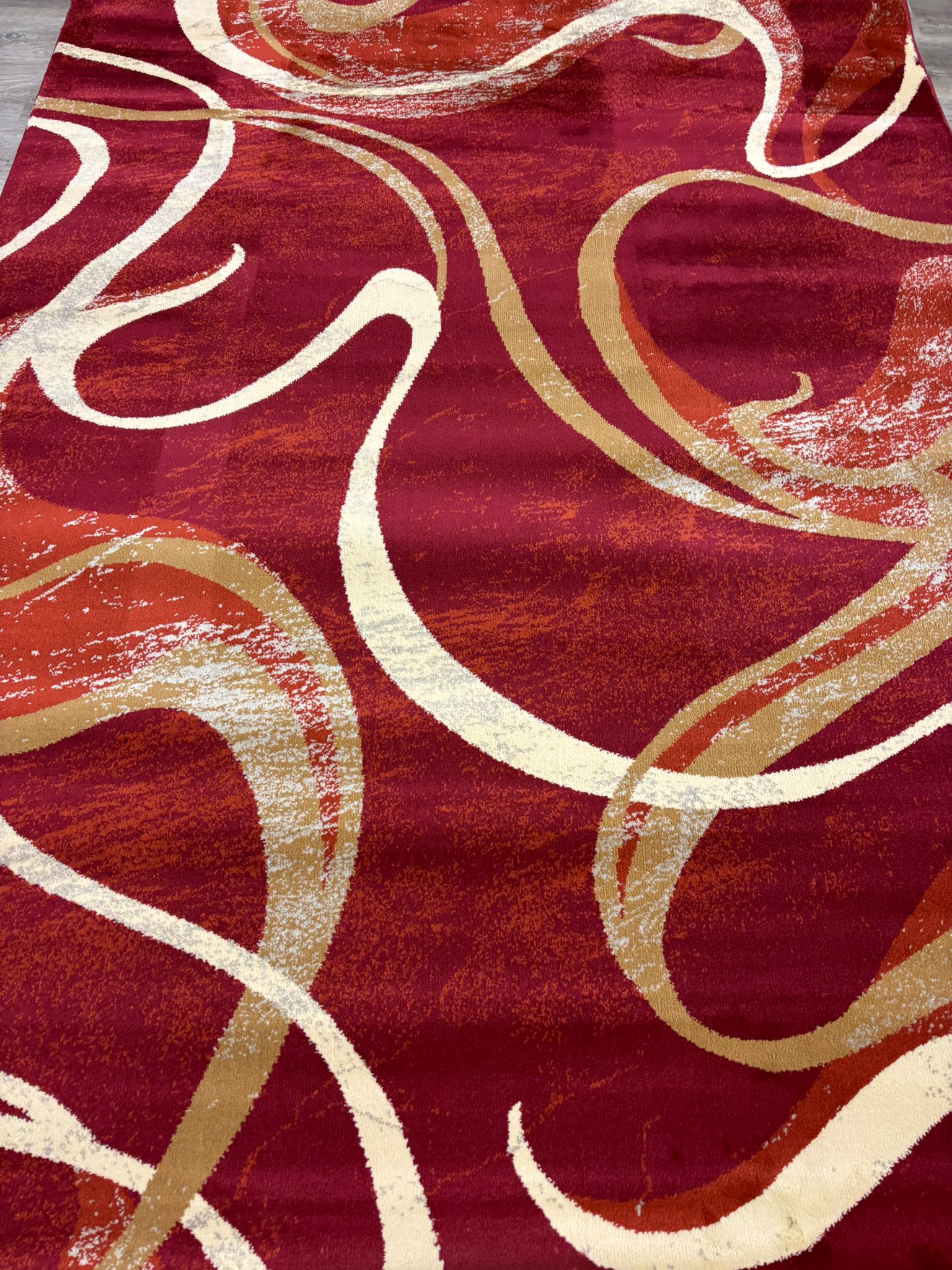 Transform your space with this dynamic red abstract rug featuring elegant golden and cream swirls. The bold design adds movement and warmth to any room, making it an ideal centerpiece for contemporary living rooms, bedrooms, or entryways.