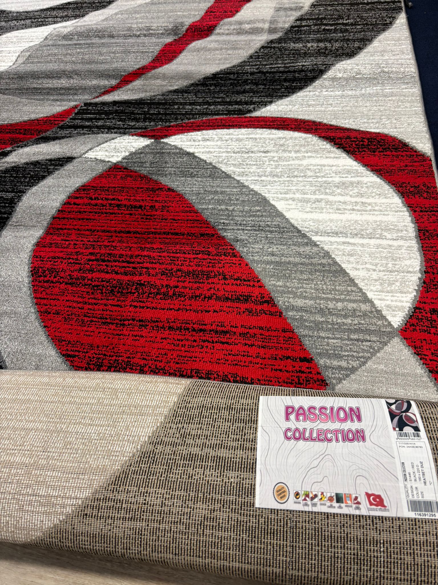 Elevate your space with this vibrant modern swirl rug, combining rich red curves with gray, black, and white gradients. This statement piece is perfect for bold interiors and adds dynamic energy to any room.